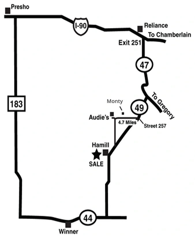 - Continue south to SD Highway 44 or local connecting routes toward Hamill
